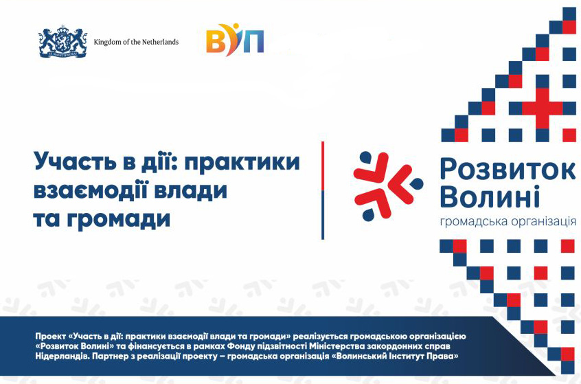 Проект «Участь в дії: практики взаємодії влади та громади» реалізується громадською організацією «Розвиток Волині» та фінансується в рамках Фонду підзвітності Міністерства закордонних справ Нідерландів. Партнер з реалізації проекту – громадська організація «Волинський Інститут Права».